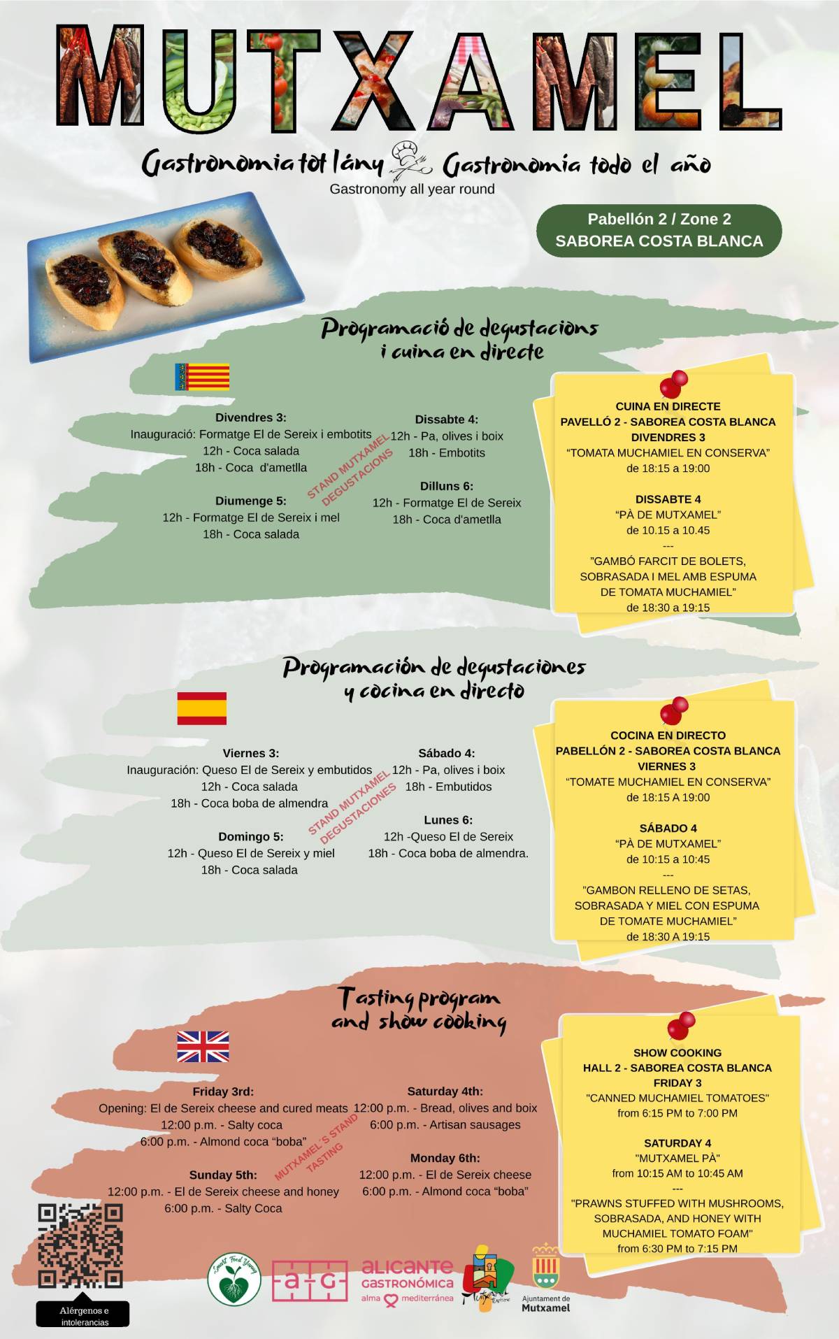 La programación contará con actividades que permitirán al público acercarse a los sabores de Mutxamel. El viernes 3 de octubre, de 18:15 a 19:00 horas, se celebrará el taller “Tomate Muchamiel en conserva”, organizado por Turismo Mutxamel. El sábado 4 de octubre, de 10:15 a 10:45 horas, tendrá lugar el taller “Pan de Mutxamel,” a cargo del maestro pastelero José Manuel González Lloret (Bollipan / Forn de la Mestra). Ese mismo día por la tarde, de 18:30 a 19:15 horas, el Restaurante Amapola (Hotel Bonalba) ofrecerá un showcooking con la receta “Gambón relleno de setas, sobrasada y miel con espuma de tomate Muchamiel.”